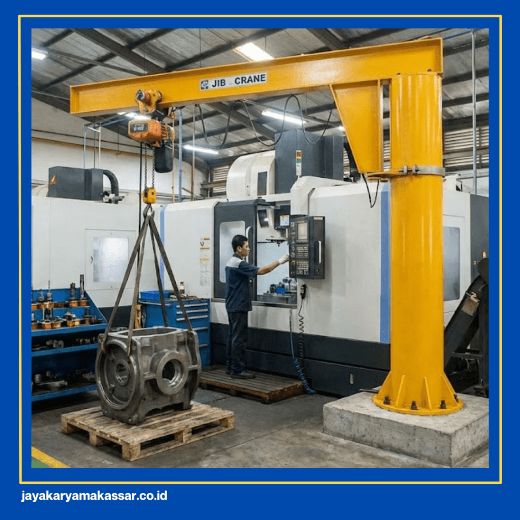 Jib Crane berfungsi sebagai asisten stasiun kerja spesifik. Lengan ayun (swing arm) tertanam kuat di satu titik pondasi. Mekanisme ini berputar dalam radius tertentu untuk menjangkau area terbatas. Alat ini sangat pas untuk mengangkat benda kerja ke mesin CNC.