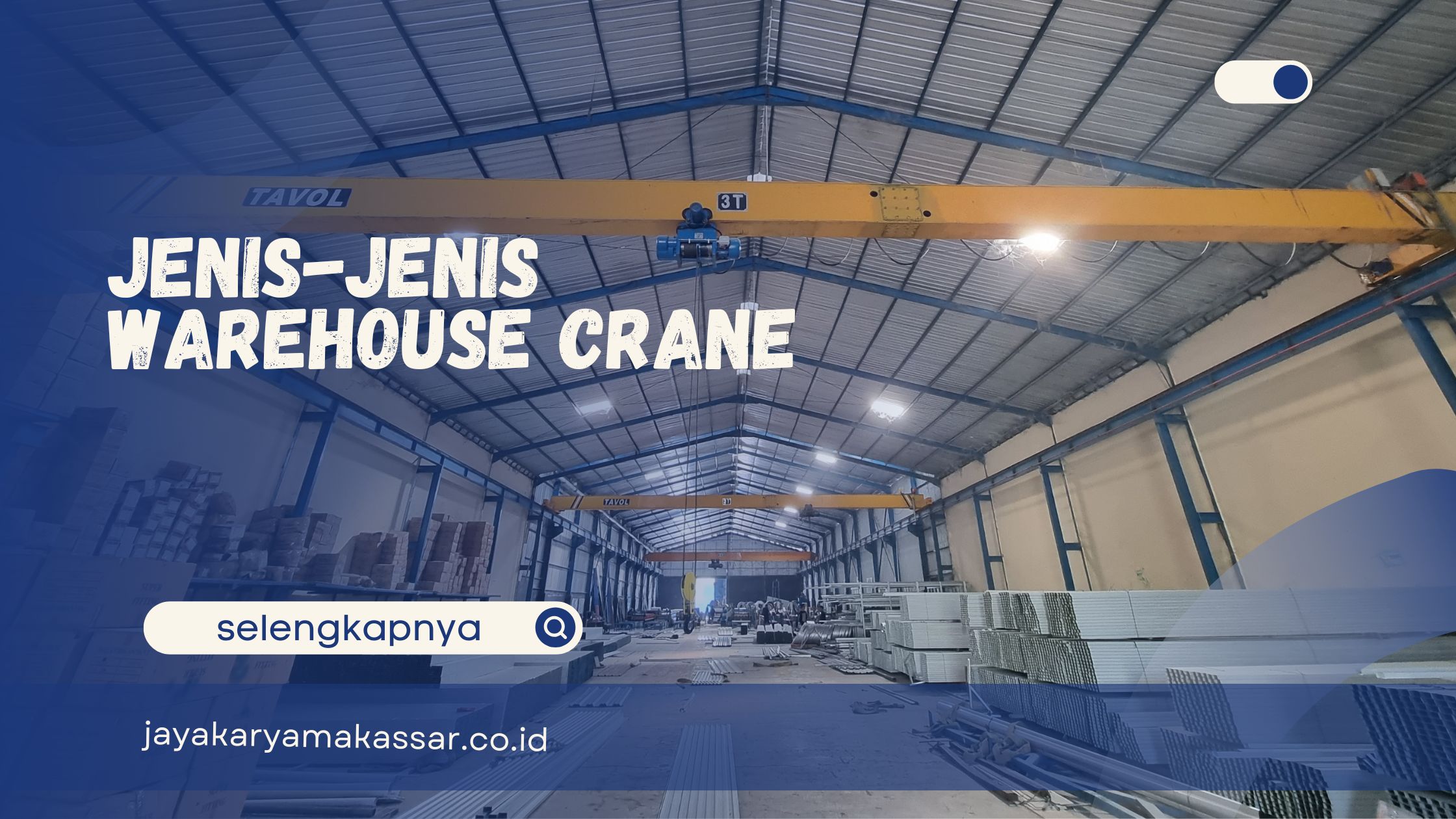 PT Jaya Karya Makassar menyediakan overhead crane dan gantry crane merek Tavol dengan konfigurasi single girder dan double girder. Kapasitas tersedia mulai dari 3 ton hingga 200 ton, produk dapat dikirim ke seluruh Indonesia, serta didukung garansi resmi.